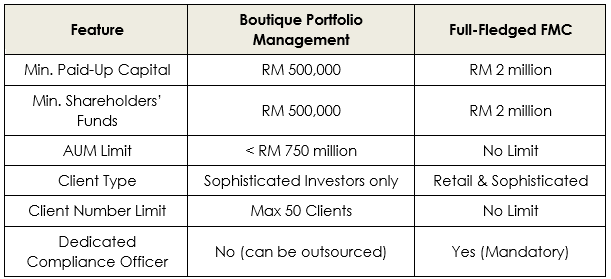 Recognising the need for a more accessible entry point for niche players, the SC introduced the Boutique Portfolio Management license. This category significantly lowers the financial barrier, requiring a minimum paid-up capital and shareholders’ funds of only RM 500,000. Furthermore, a licensed director is not mandatory, and the applicant is permitted to outsource the compliance function to a qualified provider, subject to the SC’s prior approval.